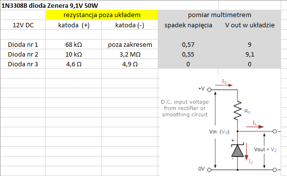 Kupiłem na eBay także 3 sztuki diod Zenera 9,1V 50W i tu warto zwrócić uwagę na sprawdzenie przed montażem. Poniżej wyniki pomiarów multimetrem oraz w tymczasowym układzie. Parametry były bardzo różne a dioda nr 3 okazała się zwarta, zwrócono pieniądze w ramach reklamacji niezwłocznie. Mimo wszystko należy uznać różnicę pomiędzy diodami nr 1 i 2 za zbyt duże. Zainstalowałem diodę nr 1. Cena jednej diody to koszt ok 12 Euro.